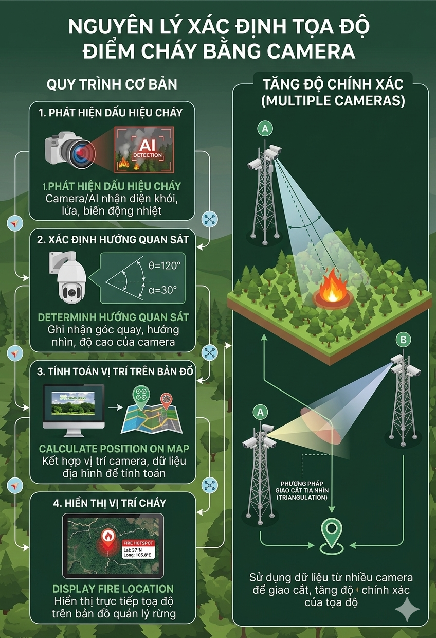 Tuy nhiên, so với các quốc gia phát triển, việc ứng dụng công nghệ xác định tọa độ điểm cháy bằng camera tại Việt Nam vẫn đang trong quá trình mở rộng và hoàn thiện. Trong thời gian tới, cùng với chuyển đổi số trong ngành lâm nghiệp, các hệ thống giám sát cháy rừng thông minh tích hợp camera, trí tuệ nhân tạo và dữ liệu GIS được kỳ vọng sẽ được triển khai rộng rãi hơn, góp phần nâng cao hiệu quả công tác phòng cháy chữa cháy rừng.